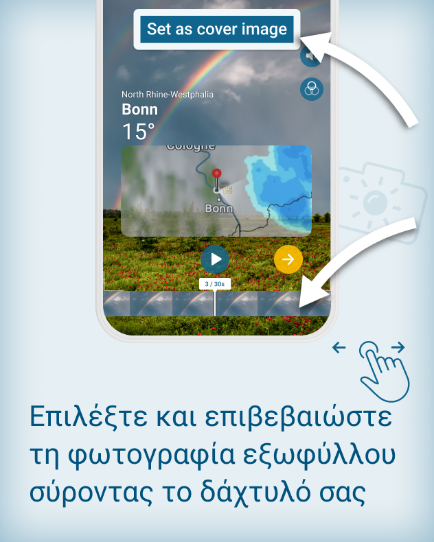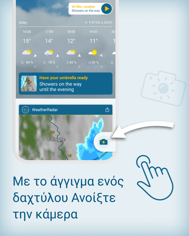 Η χαρά που μοιράζεσαι είναι διπλή χαρά. Αυτό ισχύει και για τη χαρά του να μοιράζεσαι ξεχωριστές στιγμές. Γι' αυτό στην εφαρμογή Καιρός & Ραντάρ θα βρεις μια λειτουργία που έχει δημιουργηθεί ακριβώς για αυτό το σκοπό: να βλέπεις, να θαυμάζεις, να καταγράφεις και να ενθουσιάζεις τους άλλους.