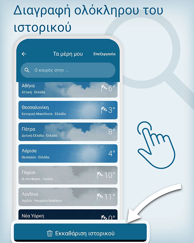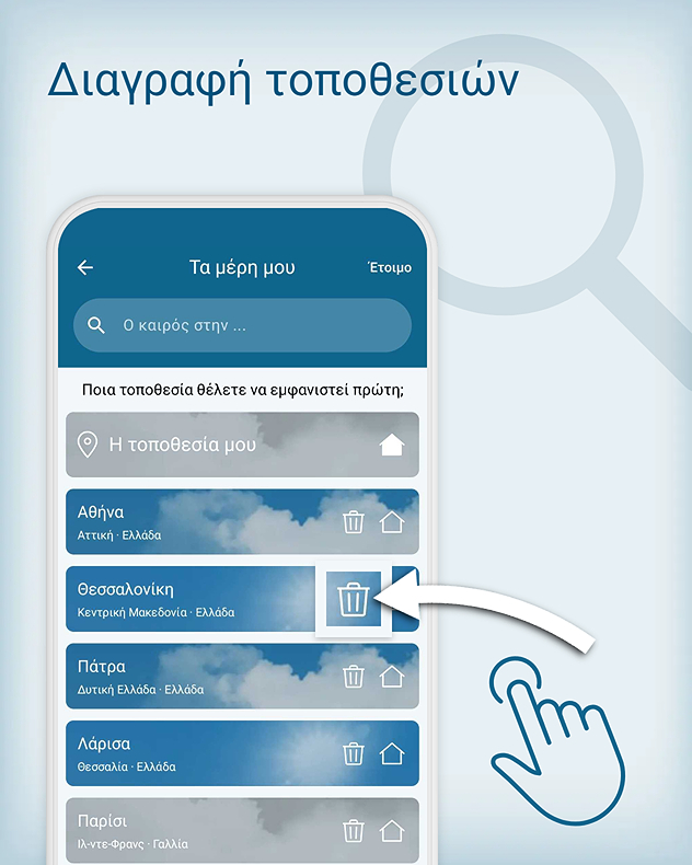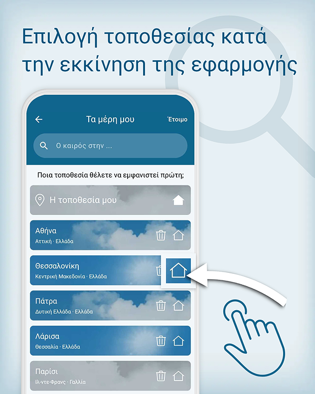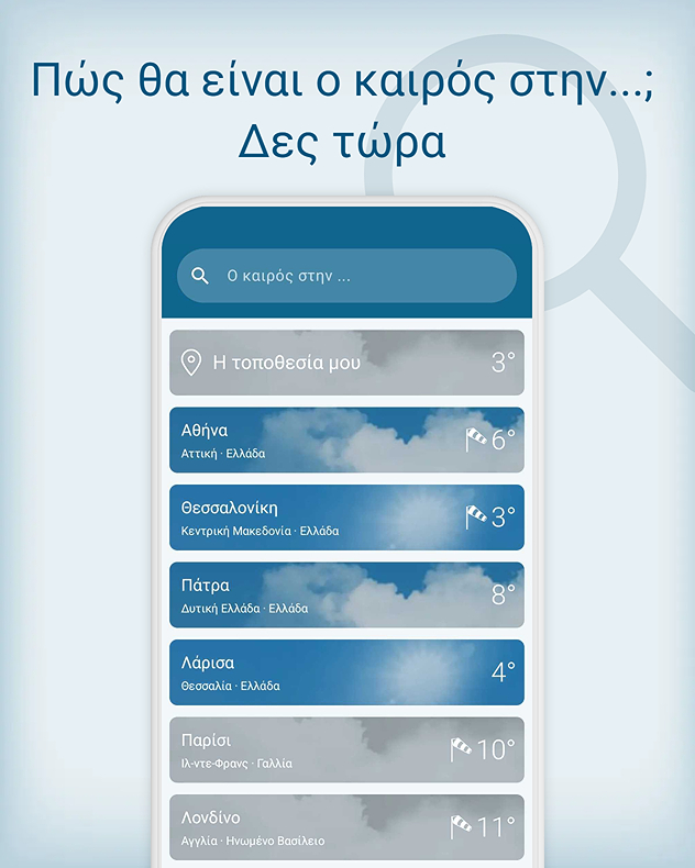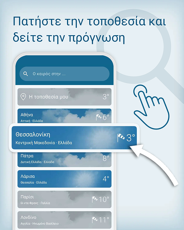 Η επιλεγμένη τοποθεσία αποθηκεύεται αυτόματα. Έτσι, όχι μόνο μπορείς να βλέπεις ανά πάσα στιγμή την πρόγνωση για την τοποθεσία σου, αλλά και να βλέπεις πώς είναι ο καιρός στα αγαπημένα σου μέρη - όπου κι αν βρίσκονται στον κόσμο.