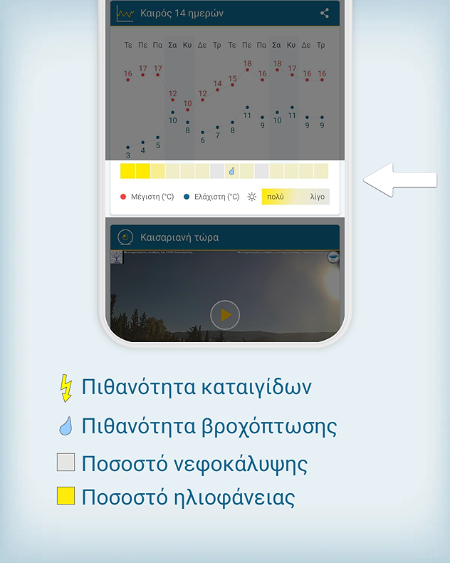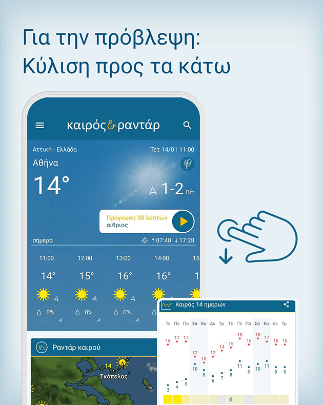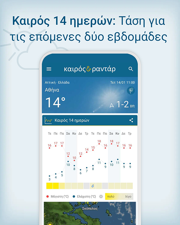 Με την πρόγνωση καιρού 14 ημερών στην εφαρμογή Καιρός & Ραντάρ, είσαι πάντα ένα βήμα μπροστά από τον ήλιο, τον άνεμο και τη βροχή!