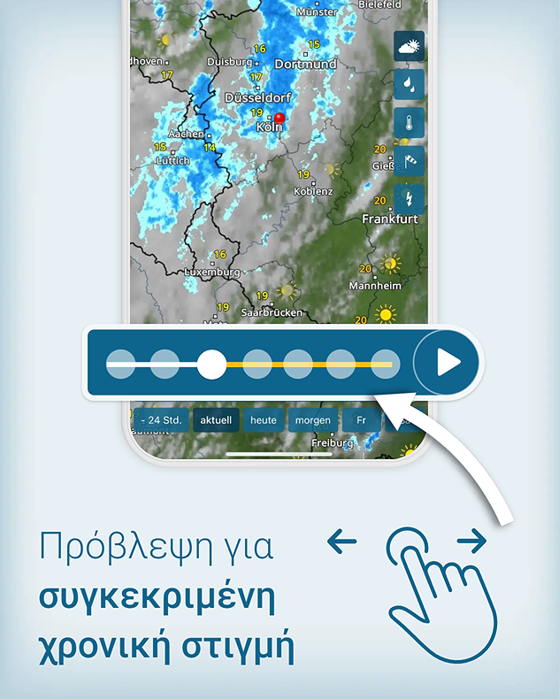 Με το ραντάρ καιρού, μπορείτε να παρακολουθείτε ζωντανά τι συμβαίνει στον ουρανό ανά πάσα στιγμή. Επιπλέον, οι επιλέξιμες περίοδοι πρόβλεψης σας επιτρέπουν να εξετάσετε το κοντινό και το λίγο πιο μακρινό μέλλον του καιρού. Αυτό σας βοηθά να αποφασίσετε, για παράδειγμα, αν χρειάζεστε ομπρέλα το απόγευμα ή αν μπορείτε να πάτε για κολύμπι στη λίμνη αύριο.